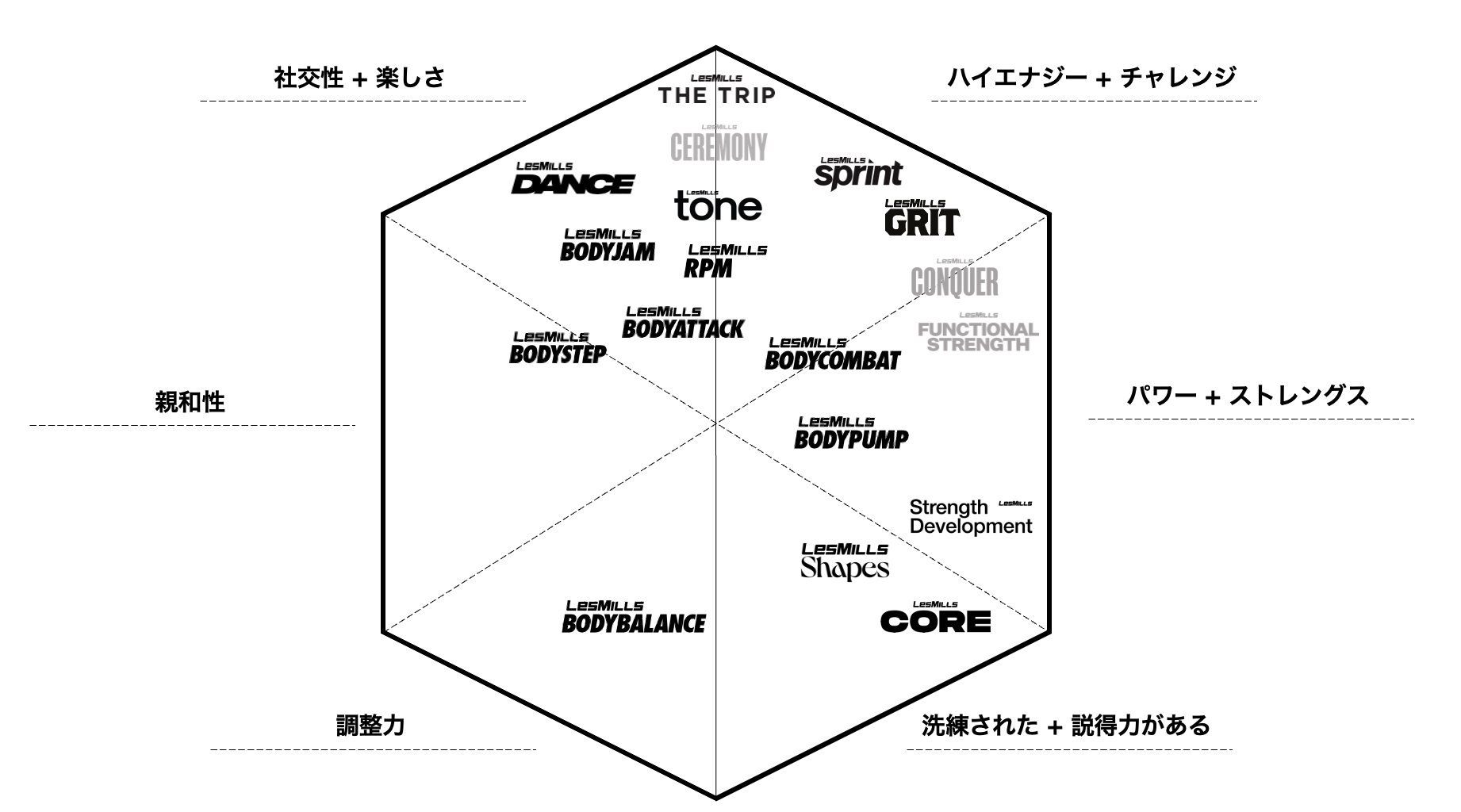 もちろん、会員を最もよく知っているのはクラブ関係者なので、本記事を参考にしながらクラス参加者のデータにも細心の注意を払い、会員の属性に合ったタイムテーブルを作成するのがコツです。成功している施設では、次に挙げるグループフィットネスの8ジャンルを組み合わせて提供しています:筋力強化&ウェイト、カーディオ、サイクル、マインド/ボディ、格闘技、ピラティス、ダンス、HIIT。下図は、Les Millsプログラムを消費者ニーズ別に分けた表です。バラエティ豊かなクラスを実施するため、導入しているプログラム間のギャップや重複を特定するのに役立ちます。