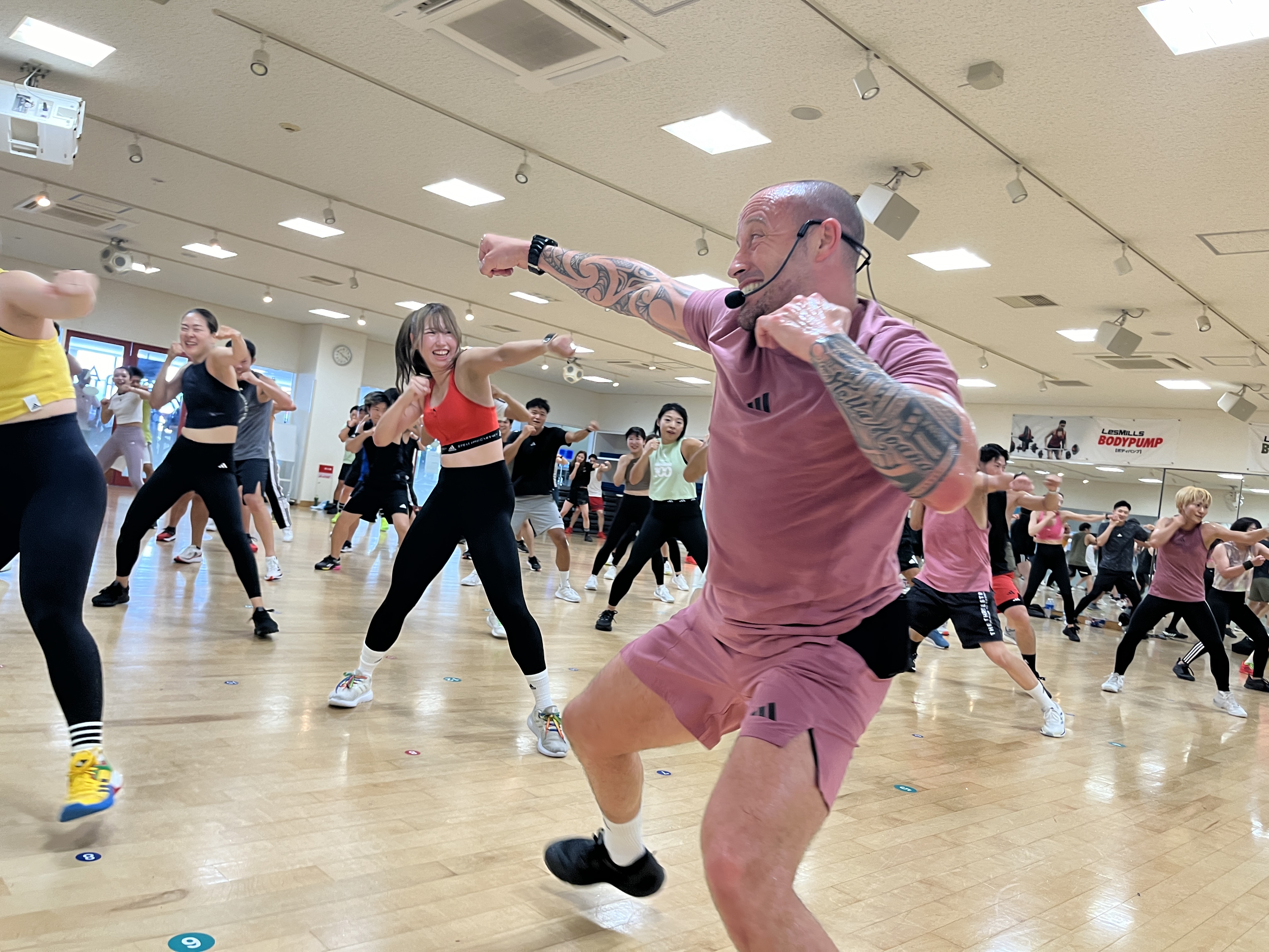 海外のプログラムディレクターさん(BODYCOMBATプログラムディレクターのダン・コーエン)に会うのは初めてで、プレミアムワークショップのお知らせを見た時から「絶対受けに行こう!」と決めていました。BODYCOMBATは持っていないのでドキドキしながらの参加でしたが、そんな緊張も忘れちゃうくらいすごく楽しくて、前半のマスタークラスはあっという間の30分でした。後半のエデュケーションも勉強になることばかりでした。レイヤー1、2、3の使い方をより深く教えてくれて、新聞に例えての説明がすごくわかりやすかったです。イメージしやすいので、「今後のクラスに使えるな」って思いました。ペアワークの時間もあり、自分の強みを自分で考えて相手の方とシェアするんですが、こんな機会がなければ、ここまで深く考えることはなかったかもしれません。こちらも今後のクラスに活かせる内容でした。